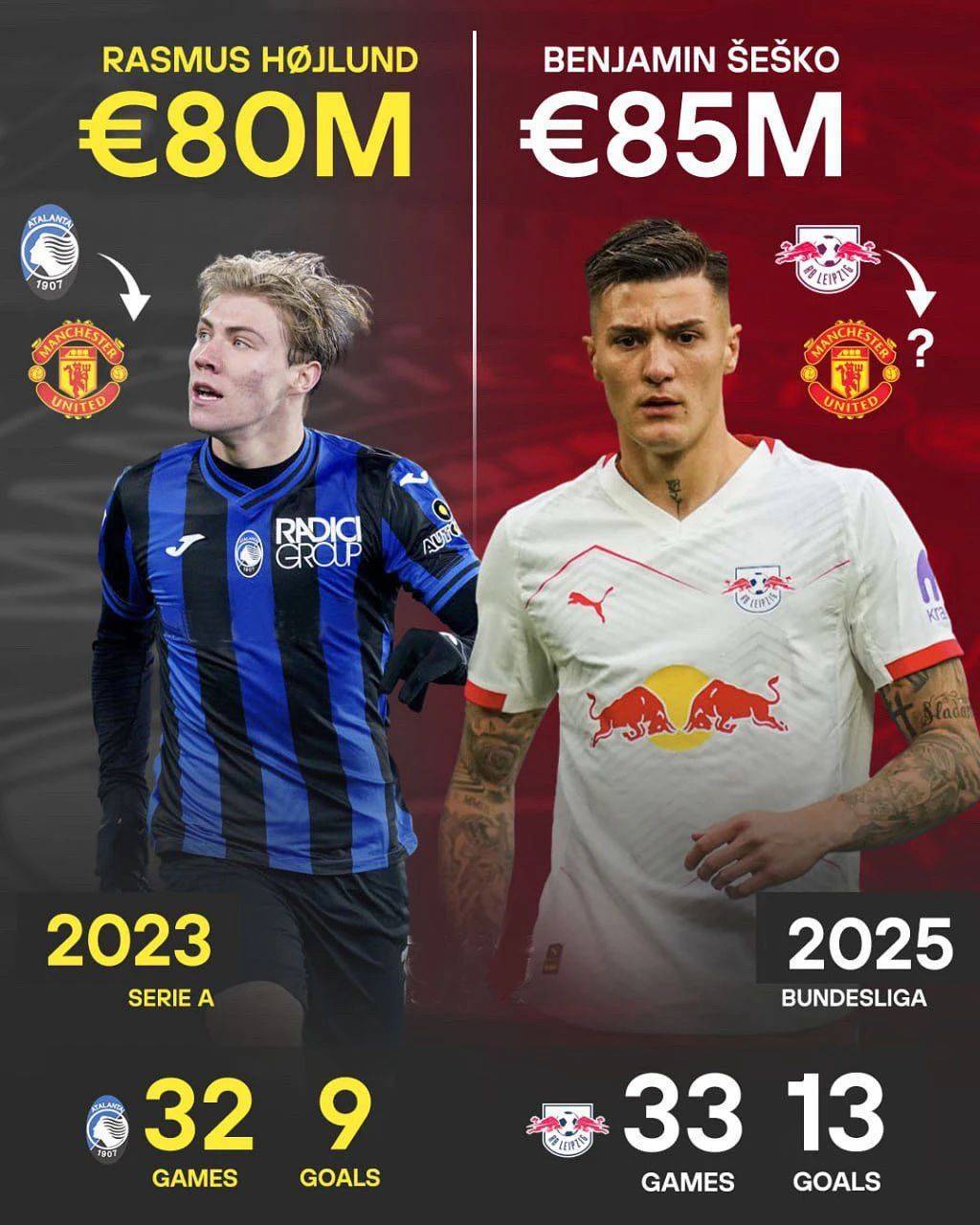一旦本杰明·谢什科完成从莱比锡红牛到曼联的转会,同龄的红魔9号霍伊伦德自有两条路:离开老特拉福德,或者冷板凳坐穿。谢什科的年龄比霍伊伦德还年轻3个月,而价格7500万英镑则高出丹麦人300万英镑,无论从什么角度,「货轮」都没有出路。